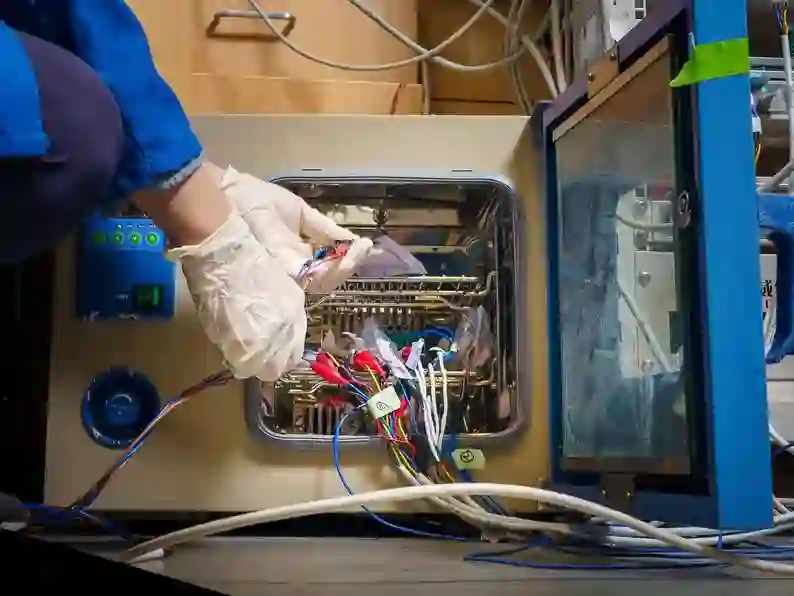 该研究的第一作者、UCSD 纳米工程博士后研究员 Guorui Cai 准备了一个电池袋电池(battery pouch cell),用于在低于冰点的温度下进行测试。