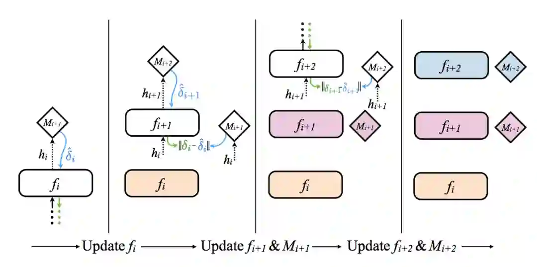让我们聚焦左边的第二块区域。看到了没有?梯度(Mi+2)经fi+1反向传播至Mi+2。如你所见,每个合成梯度生成器实际上仅仅使用下一层生成的合成梯度进行训练。因此,只有最后一层实际在数据上训练。其他层,包括合成梯度生成网络,基于合成梯度训练。因此,训练每层的合成梯度生成网络时,只需等待下一层的合成梯度(没有其他依赖)。太酷了!