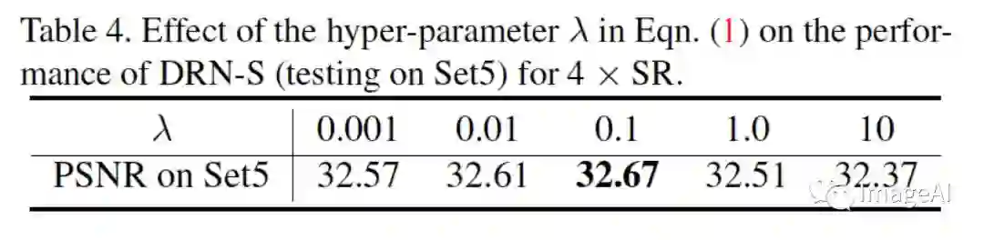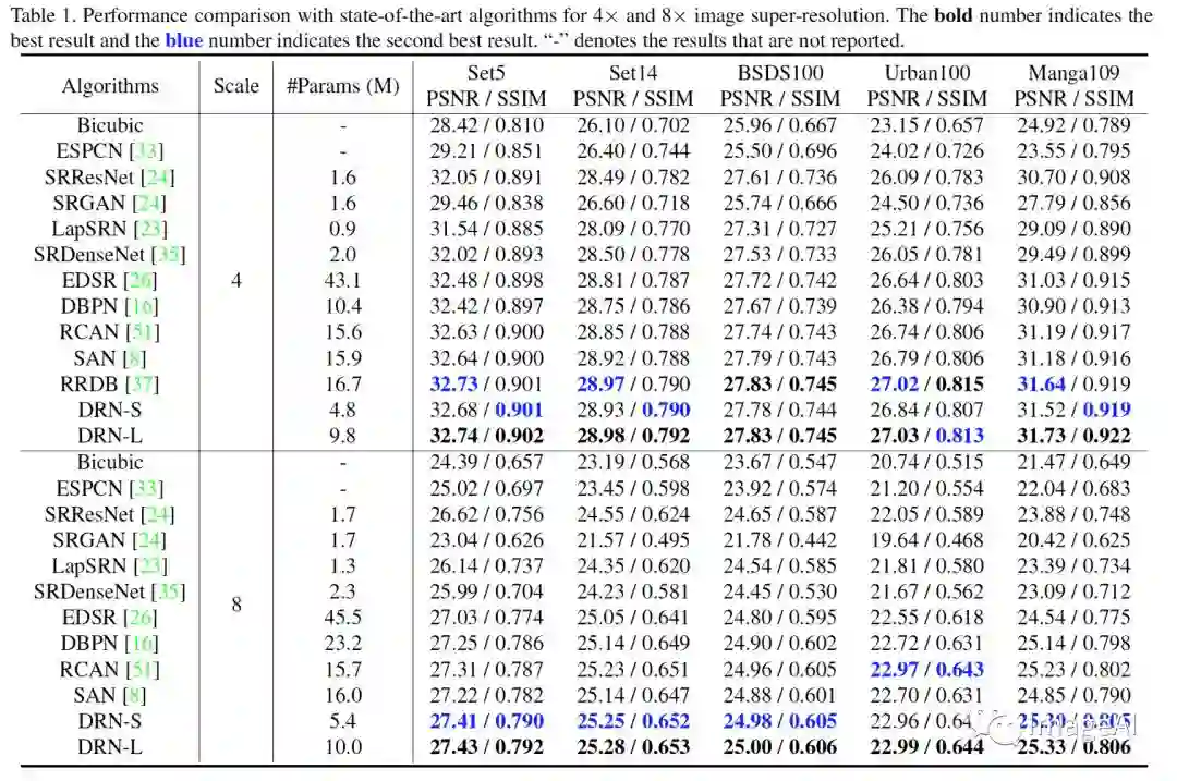 有监督部分和目前大部分模型一样,使用的是常见的Data pair数据集DIV2K和Flick2K作为训练集,测试集为常见的SET5, SET14, BSDS100,URBAN100 和MANGA109。模型设置上,作者设置了两个不同参数量的模型,DRN-S(小模型)和DRN-L(大模型)。