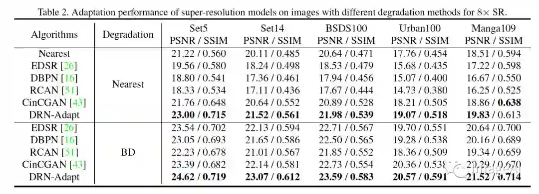 「为了定性的计算PSNR和SSIM:」data unpair则是在ImageNet中随机选取了3K张图像,并对图片使用Nearest和BD两种不同的方式采样出LR图像,将LR用于半监督训练。其结果同样非常不错。