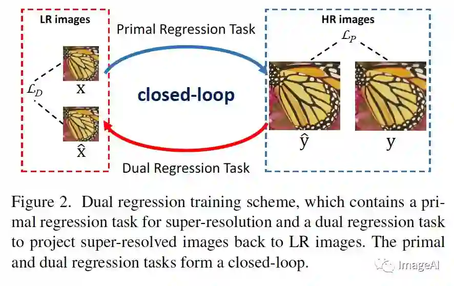 那么本文针对这两个问题,通过对偶学习(Dual Learning),建立了个由LR->HR->LR闭环对偶回归(Dual Regression)模型。