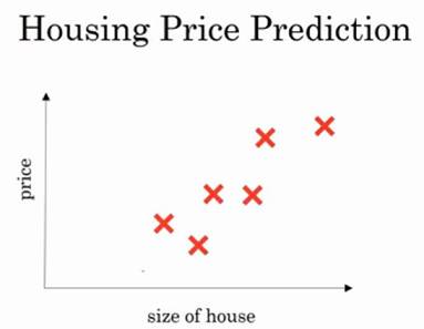 我们从一个房价预测的例子开始。假设有一个六间房屋的数据集,已知房屋的面积,单位是平方英尺或平方米,以及房屋价格。想要找到一个函数,根据房屋面积来预测房价。