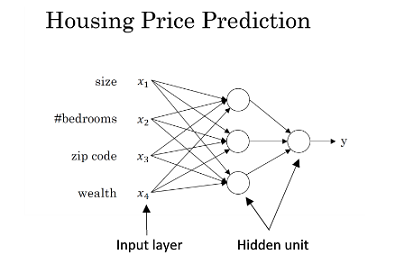 那么你实际上做的就是这样,这里有四个输入的神经网络,输入的特征可能是卧室的数量,邮政编码和周边的富裕程度。已知这些输入的特征,神经网络的工作就是预测对应的价格。
