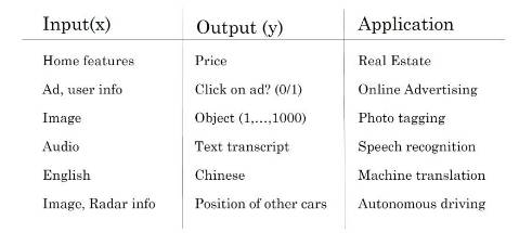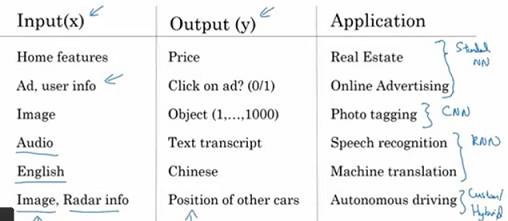 在监督学习中,输入x会习得一个函数,它映射到输出y。比如我们之前看到的,应用于房价预测的例子。输入房屋的一些特征,就能输出或者预测价格y。下面是一些其它例子,这些例子中神经网络效果拔群。