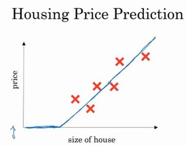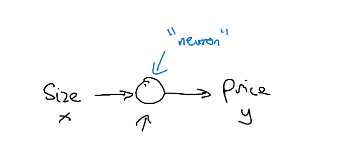 这里的直线拟合得很好。你也许可以把这个房屋加个拟合函数看成是一个非常简单的神经网络,你刚刚用它来拟合房屋价格。这几乎是最简单的神经网络了。