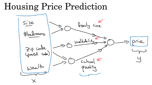 我画的每一个小圈圈,都可能是一个 ReLU,即“修正线性单元”,或者其它的不那么线性的函数。基于房屋面积和卧室数量,你可以估算家庭人口。基于邮编,可以评估步行化程度,也可以评估学校质量。最后你可能会认为,人们愿意在房屋上花费多少钱,和他们关注什么息息相关。在这个例子中,家庭人口、步行化程度以及学校质量,都能帮助你预测房屋的价格。