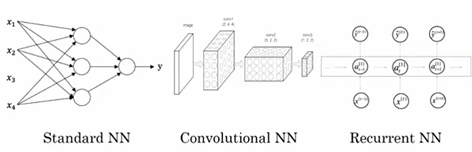所以,为了更具体地说明,标准的 CNN 和 RNN 结构是什么。在文献中,你可能见过这样的图片,这是一个标准的神经网络。你可能见过这样的图片,这是一个卷积神经网络。在后续的课程,我们会去了解这幅图的含义和如何实现它。卷积网络通常用于图像数据。你可能也会看到这样的图片,后续的课程也会去实现它。循环神经网络非常适合处理一维序列数据,其中包含时间成分。