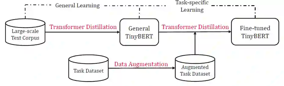 训练时提出了两阶段蒸馏框架,通用模型蒸馏和任务相关蒸馏。通用模型蒸馏使用大规模通用语料进行蒸馏训练,这一阶段的蒸馏不包括预测层 logits 的蒸馏。进行任务蒸馏时,先对任务数据集进行数据增强,然后进行蒸馏,此时的 teacher 是 BERT 在改任务的微调模型。