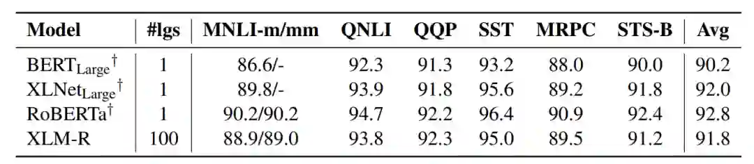 XLMR 也在 XNLI 上进行的试验评测,如下图所示: