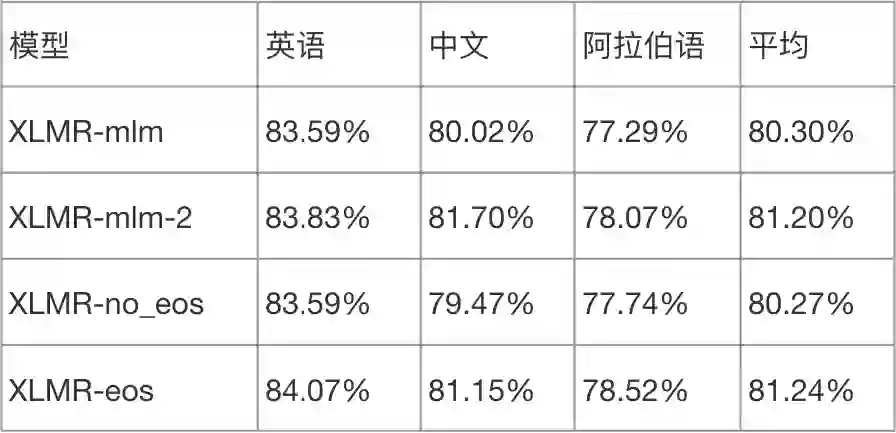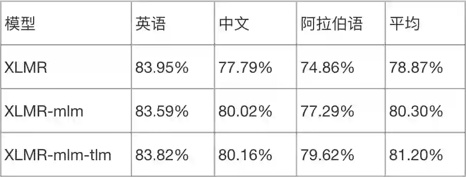 TLM 任务需要使用平行语料,但是我们没有,于是我们尝试使用其他语种文本的机器翻译作为平行文本,构造平行文本对训练数据。我们采用 MLM+TLM 任务进行二次训练,下表是实验对比,加入 TLM 任务后英语和中文没有明显提升,阿拉伯语提升明显。说明 TLM 任务确实带来了一定的提升。但是在后续的知识蒸馏时,加入 TLM 任务的模型蒸馏效果较差,所以后续没有使用 TLM 任务。