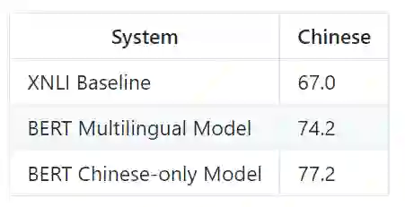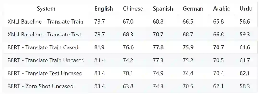 M-BERT 在 XNLI 数据集上进行评测( MultiNLI 的多语言版本),下面是其实验结果: