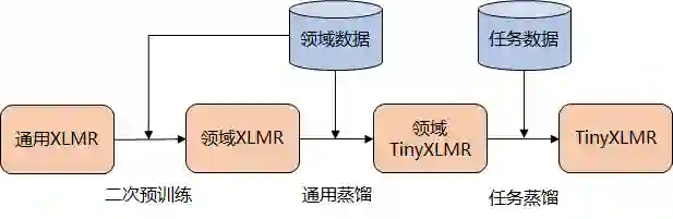 具体任务的训练数据是有限的,因此仅仅使用任务蒸馏无法获得类似预训练模型一样的泛化能力。我们可以先进行通用蒸馏,令小模型具备通用知识,然后再进行任务蒸馏,学习具体任务知识。考虑到用开放语料进行通用蒸馏比较耗时,我们使用二次预训练 XLMR 的训练数据,进行了领域内的通用蒸馏。