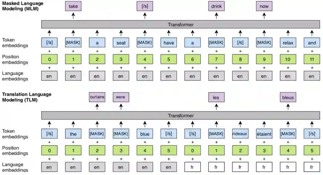 2. 改良了基于单语种语料的无监督学习 MLM 和提出了新的基于跨语言的平行语料的有监督学习方法 TLM。