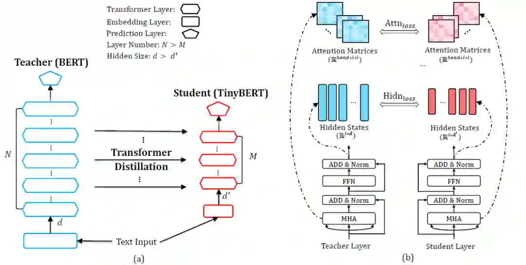 TinyBERT 提出了从 transformer 的具体组件蒸馏,包括 embedding 层;transformer 的隐层和 attention 矩阵;预测层的 logits,总体的损失函数是相应的 4 部分。预测层 logits 的 loss 定义为 teacher 的 logits 与 student 的 logits 的 soft cross-entropy loss,其他 3 个 loss 是 teacher 与 student 相应组件的 MSE loss。