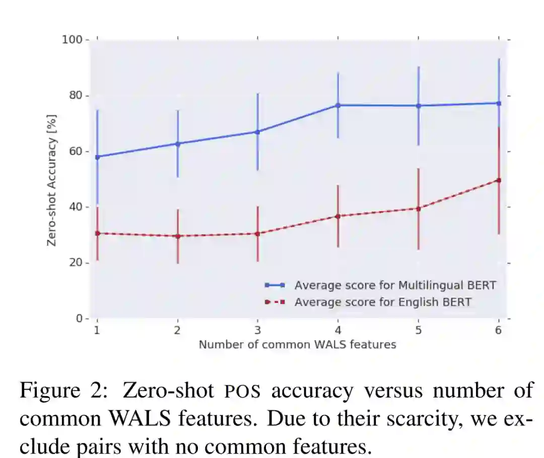 图 2 展示了多语言 BERT 在零样本迁移学习上 POS 任务的准确率与 WALS 特征数量的对比图。我们可以看到,准确率会随着语言相似度的提升而提升,这证明多语言 BERT 对具有相似特征的语言的迁移学习更加友好。