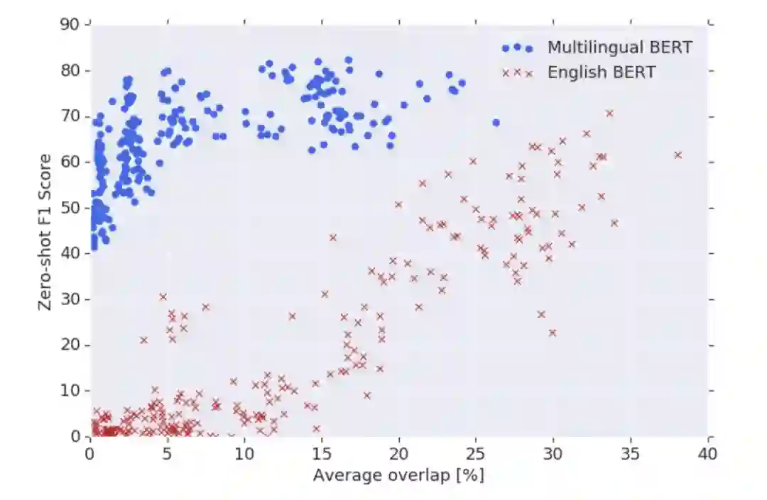 从上图看(横坐标是通过上面公式计算,纵坐标是 F1 值),我们可以看到 English BERT 的性能表现非常依赖于词汇重叠,迁移学习的能力会随着重叠率的下降而逐渐下降,甚至在完全不同的语言文本中(即重叠率为 0)出现 F1 分数为 0 的情况。