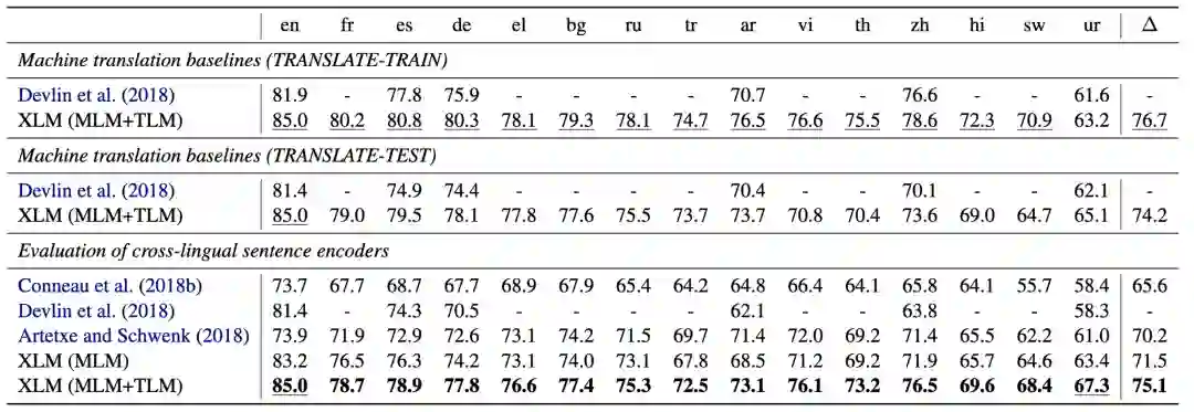 ▲ Resultson cross-lingual classification accuracy. Test accuracy on the 15 XNLIlanguages.