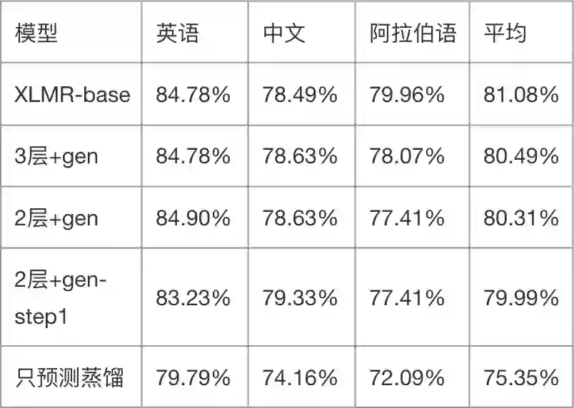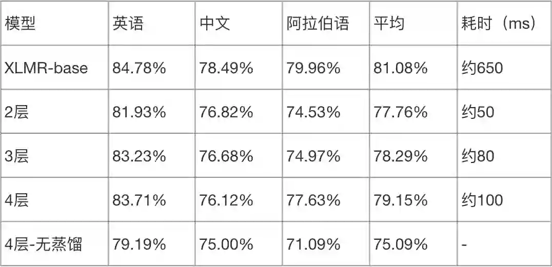 实验结果如下表,蒸馏的4层模型效果最好,平均准确率只比 XLMR-base 降低了 1.93%,2、3 层的模型效果较差。从耗时上看,4 层小模型的耗时较高,2 层最低。所有蒸馏模型效果都优于没使用蒸馏、直接随机初始化然后训练的模型(4 层-无蒸馏)。