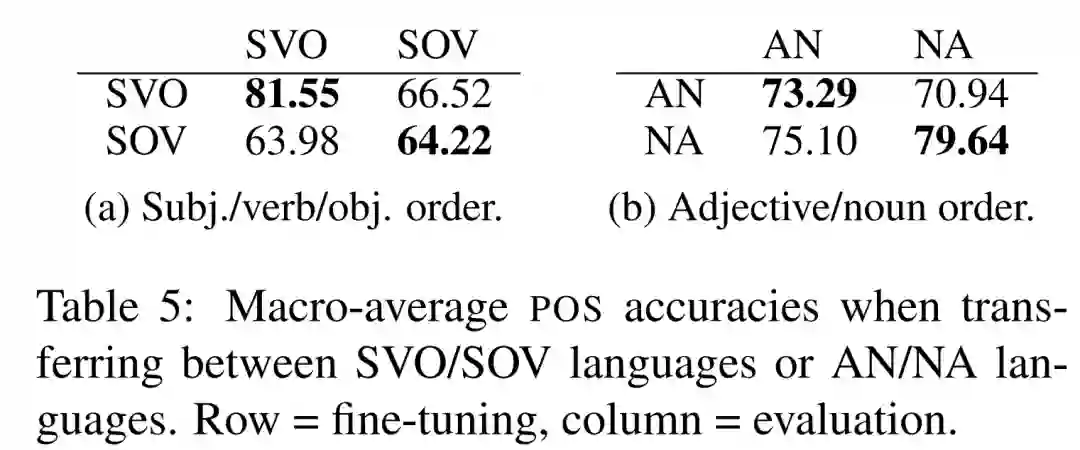 table 5 展示了在 POS 任务上进行的跨语言迁移学习的宏平均准确率与语言类型特征的对比。我们可以看到性能表现最好的情况是语言类型特征一样(SVO 和 SVO,SOV 和 SOV,AN 和 AN 以及 NA 和 NA)的迁移学习,这表明虽然多语言BERT能够学习到一定的多语言表征,但是似乎没有学习到这些语言类型结构的系统转换去适应带有不同语言顺序的目标语言。