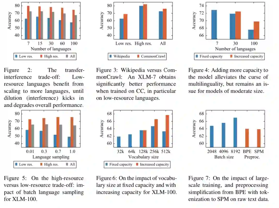 图 2 所示,在初期,语言数量的增加可以带动小语种语言的学习,小语种语言效果逐渐提升。而当数量达到并超过某个点时,模型总体迁移效果下降,包括高低资源语言。整体上,语言越多,模型学习难度越大。7 种语言到 100 种语言效果从 71.8% 下降到 67.7%。