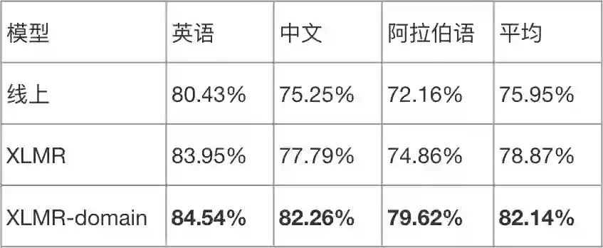 先上最终效果,下表对比了有无二次预训练的效果,XLMR 是直接用 12 层的 XLM-RoBERTa base 模型微调,XLMR-domain 是先进行二次预训练,然后再微调。XLMR 微调相比线上模型带来平均 2.92% 提升,二次预训练进一步增加了平均 3.27% 的提升。