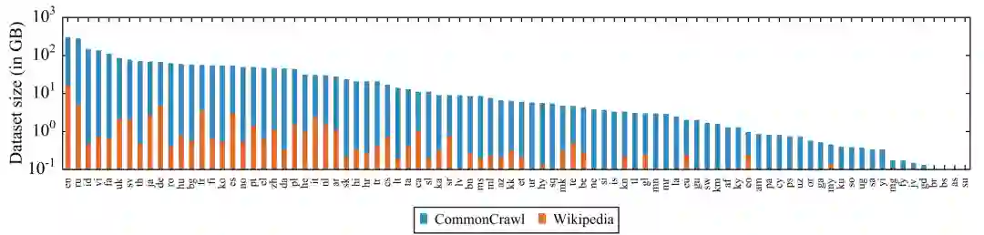 训练数据:作者采用 CommonCrawl 作为训练数据,并且通过采样加强了小语种的训练数据比例,下图是 CommonCrawl 和 Wikipedia 各语言语料规模的对照,CommonCrawl 规模更大,特别是小语种的优势更为明显。
