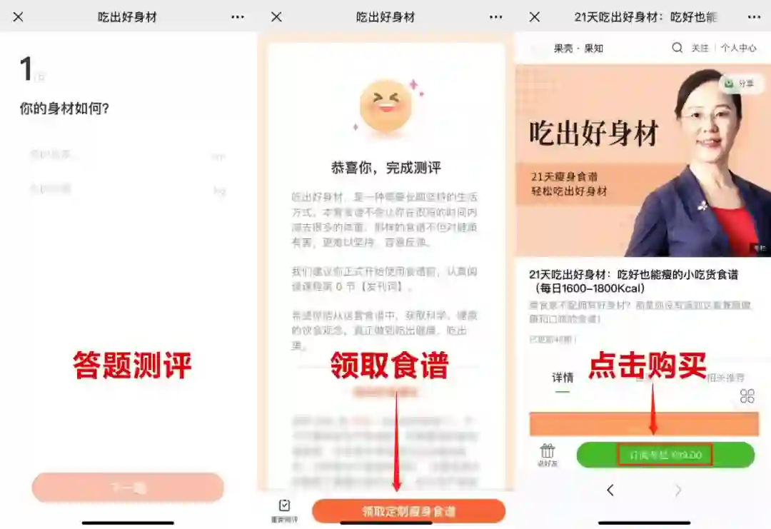 我们会先请你完成一套测试,然后根据结果,给你一套适合你的瘦身食谱。