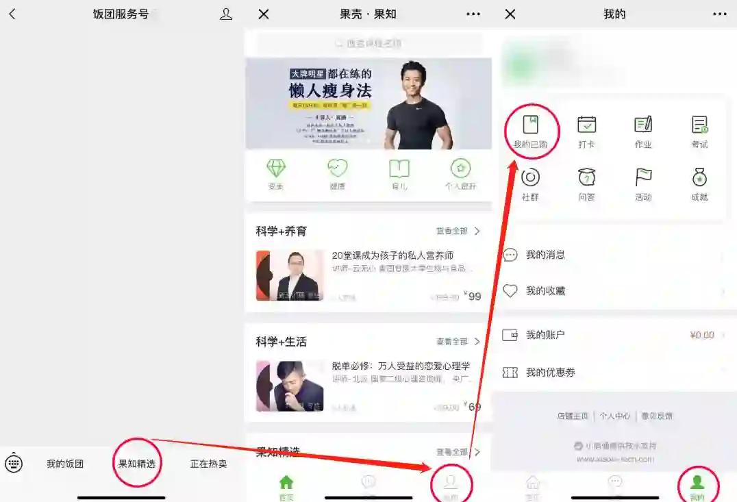 第一次购买后,会自动进入课程。以后如再想进入课程,请搜索关注"饭团服务号"(fantuan-app),点击下方[果知精选]-右下角[我的]-左上方[我的已购]即可找到。
