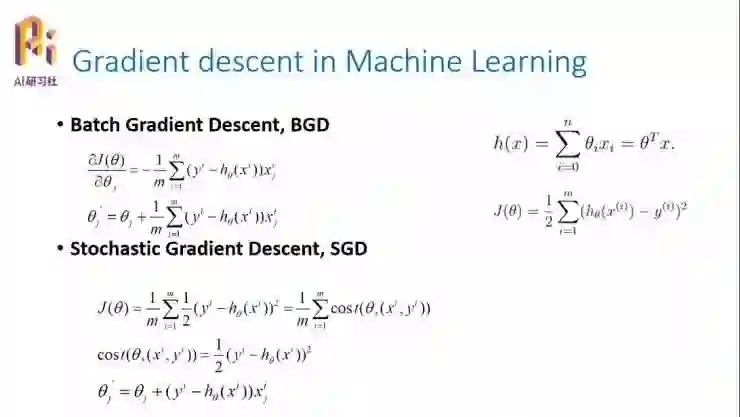 首先我们要求它的偏导数,∂J(θ)/∂θj,它表示一个方向,然后沿着这个方向更新那个变量。在变量更新的时候,批梯度下降是指每一次的变量更新,都会用到所有的 xj;然后从 i=1 到 m,会用到所有的单独变量的偏导数。比如假设这个系统里面的每一个样本有五个特征的话,那么在更新任意一个权值的时候都要把这五个特征遍历一遍。