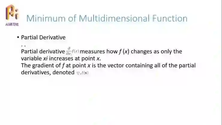 把所有的变量的偏导数求出来,并用向量的形式表示出来,可以表示成这个形式。刚才我们分析过了,如果要找到局部极值点的话,我们最快的方向是求导数、沿着梯度的方向;那么多变量系统里面也一样,就是说我们要求一个系统的最小值的话,还是通过求导,但这次是多变量的系统,所以我们的求导要改成偏导数向量的方向来去寻找新的最值。