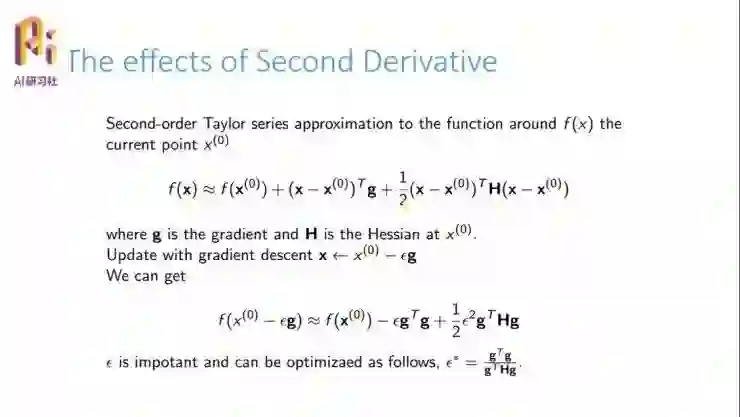 那么二阶矩阵有什么影响,它对先前的一阶矩阵梯度下降的不足有什么样的改进呢?简单分析一下,一个 f(x) 可以做这样的泰勒展开,其中包含特定点的值,这个 g 表示的是一阶导数,也就是梯度,然后 H 是一个二阶的梯度矩阵。