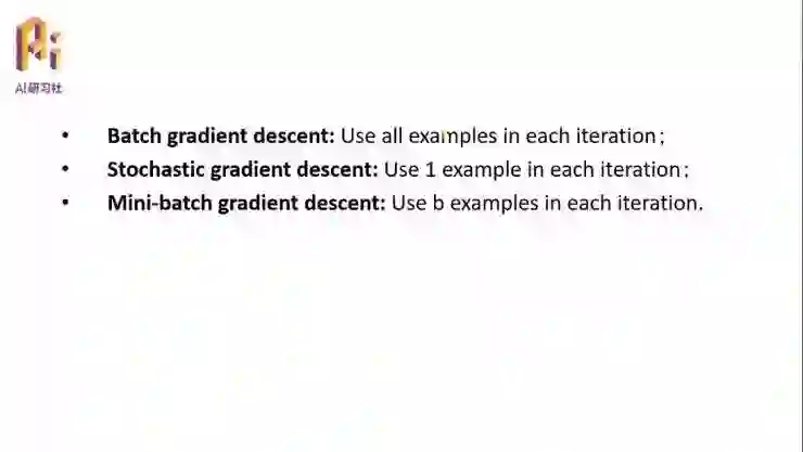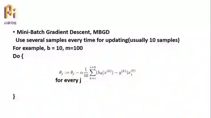 这两个方法就有点矛盾,一个是计算量大,但是全局最优,收敛比较快;一个是计算量小,但是收敛比较慢,只能找到最优目标值的附近。所以又产生了一种调和的算法,叫做小批量梯度下降,Mini-Batch Gradient Descent。其实很简单,既不像批量用到所有的特征去更新权值,也不像随机梯度下降只用其中一个,我选取一部分,假设每个样本有 100 个特征,我只取其中的 10 个特征用于每一次的权值更新。那么首先它的计算量是下降的,其次它也并不是仅仅按照其中某一个、而是它是按照了 10 个特征向量所在的方向进行搜索,既保证了搜索速度,又保证了计算量,这是目前在梯度下降中用的比较多的一个方法,算是一个 BGD 和 SGD 两种方法的折中方法。