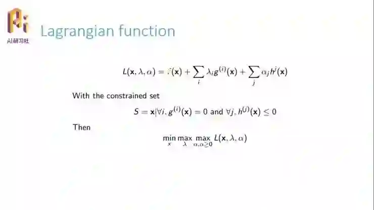 前面提到我们要构造拉格朗日函数。要构造拉格朗日函数也简单,我们现在有一个等式约束,还有一个不等式约束,只要在等式约束和不能约束之前加入一个系数,当然我们是把这些系数看作变量的。把这些系数加入到原来的函数之上,构成了一个新的函数系统,我们就可以把它叫做广义拉格朗日函数。