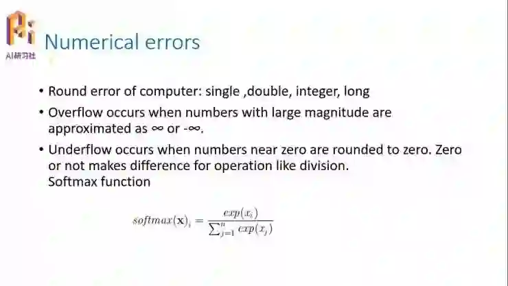 我们首先来看一下机器学习中的数值计算问题。所谓的机器学习或者深度学习,其实最终的目标大部分都是极值优化问题,或者是求解线性方程组的问题。这两个问题无论哪个,我们现在的求解办法基本上都是基于计算机的反复迭代更新来求解。因为目前肯定是没有解析解的,大家都是通过离散数学来求解这两个问题。