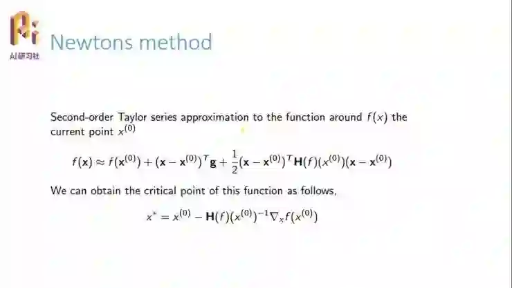 我们看一下牛顿迭代方法,这是刚才提到的泰勒展开,然后现在想要找到这个系统的极值点,当然,仅仅求导就行了。根据一阶导数为 0,它的临界点就是图中下方这个公式。这样我们更新就按照这个公式。