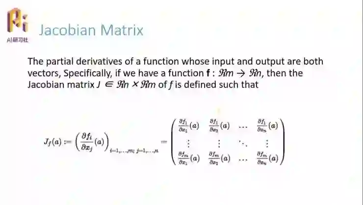 二阶导数的意义就是我们可以分析这个系统。下面先介绍一个雅克比矩阵(Jacobian Matrix),我们的系统是一个多输入、多输出的系统,它变量的范围是 Rm 域的范围,输出是 Rn 域的范围,那么 f(x) 的雅克比矩阵就是,针对所有的输入啊求导,比如第一行是那个 f1 对所有的输入变量求导,第二行就是 f2,f 的第二个变量,对所有的变量求导;同理,最后一行就是 fm 对所有的变量求导。这就是雅克比矩阵的定义。