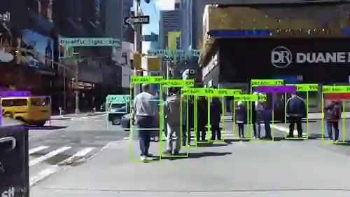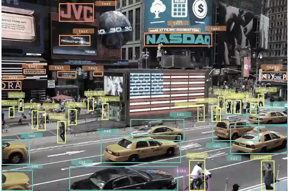 在这个密集图像中,我们可以看到计算机视觉系统识别出大量不同对象:汽车、人、自行车,甚至包含文本的标志牌。