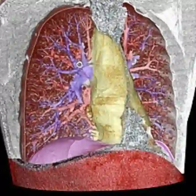 上图是观察胸腔元素所需的图像分割结果。该系统分割每个重要部分并着色:肺动脉(蓝色)、肺静脉(红色)、纵膈(黄色)和横膈(紫色)。
