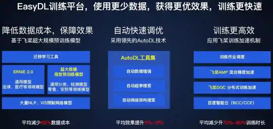 EasyDL训练平台可以帮助用户使用更少的数据,获得更优的效果,而且训练速度更快。具体来说,基于百度自研的大规模预训练模型,大幅降低了数据成本;模型的调优方面,采用了领先的AutoDL技术;在训练方面,应用了飞桨内的训练加速机制。