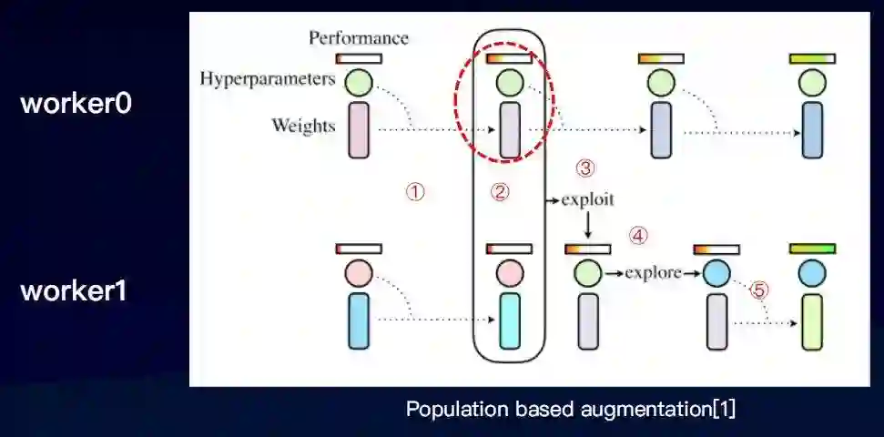 通过第一步训练,第二步需在某一个时间点,比较两个进程的效果,效果更优的进程就会取代效果差的进程的权重。第三步,直接复制权重。第四步,扰动原来的超参,产生一组新的超参,并继续训练。