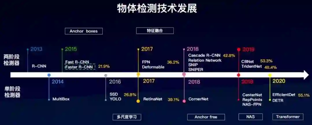 物体检测技术已经发展了很久,从13年至今,主要有两个方面的发展,一是两阶段检测器,二是单阶段检测器。总体来说技术朝着越来越自动化、越来越高效的方向发展,来满足商业化的需求。