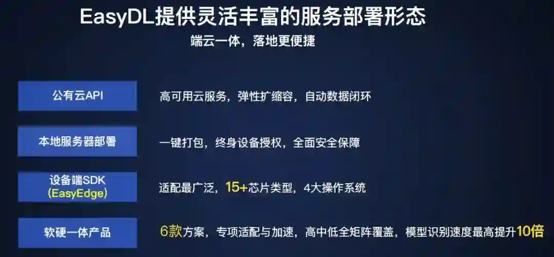 EasyDL提供了灵活丰富的服务部署形态,包含公有云部署、本地服务器部署、设备端SDK以及软硬一体产品。