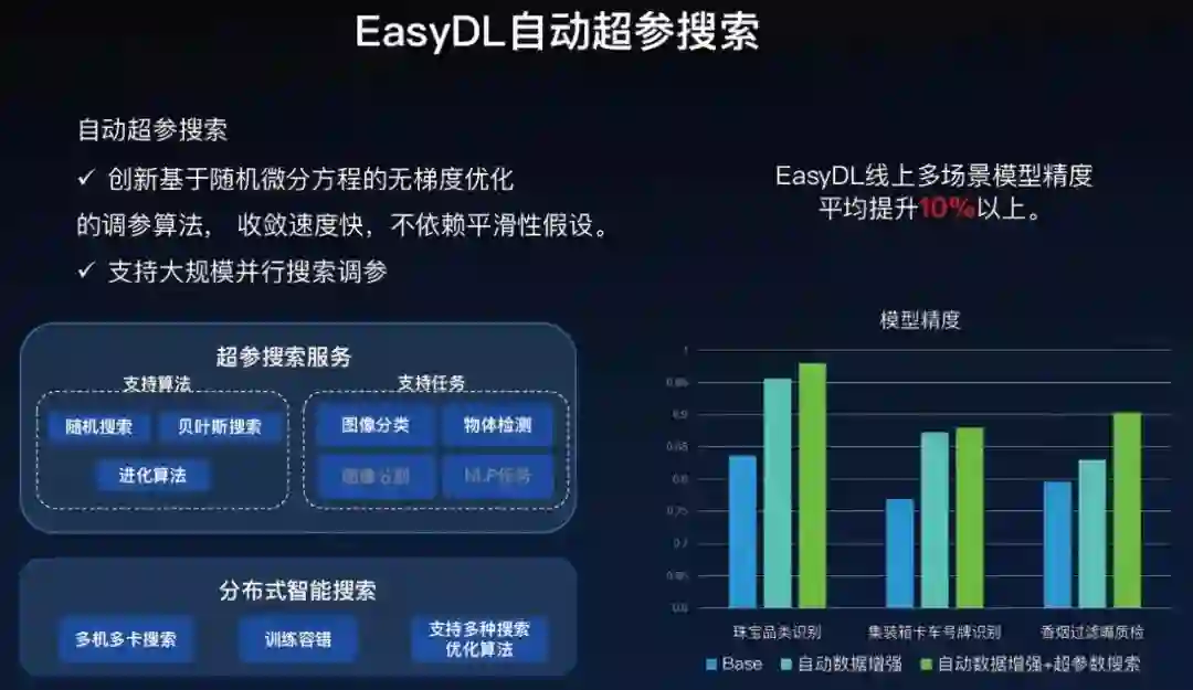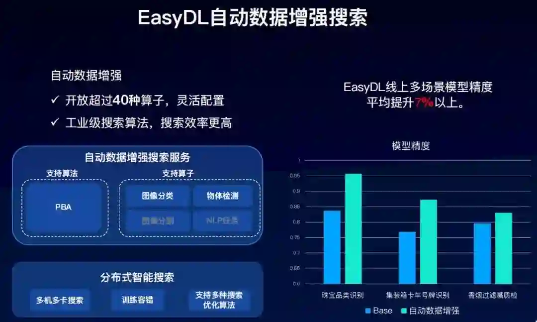 并且提供了工业级的搜索算法,搜索的效率更高。在EasyDL线上的多场景模型精度上,平均提升了7%以上。