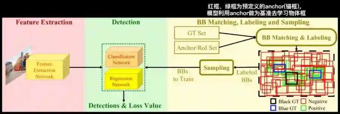 第二个部分是bonding box Matching,Labeling and Sampling模块,输入一系列的物体标注框,会有一系列的anchor(锚框),比如上图最右边的红色和绿色框就是我们预先定义好的anchor,模型就会用这些anchor作为一个基准,再去学习物体的定位。有了这些anchor之后,我们要和这些GT框进行匹配,去挑选出与物体比较吻合的框,称为正样本,就是绿色的框,不符合的框是负样本。