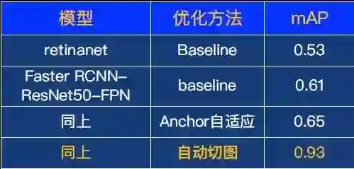 回到案例,采用这种自动切图技术,效果从0.65直接提升到0.93,这个效果的跨越幅度非常大。这也证明了自动切图算法能够从根本上能够解决小目标检测的问题。