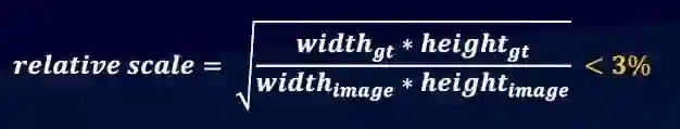 因此,我们给出相对的定义,物体标注框的长宽乘积,除以整个图像的长宽乘积,再开根号,如果结果小于3%,就称之为小物体。