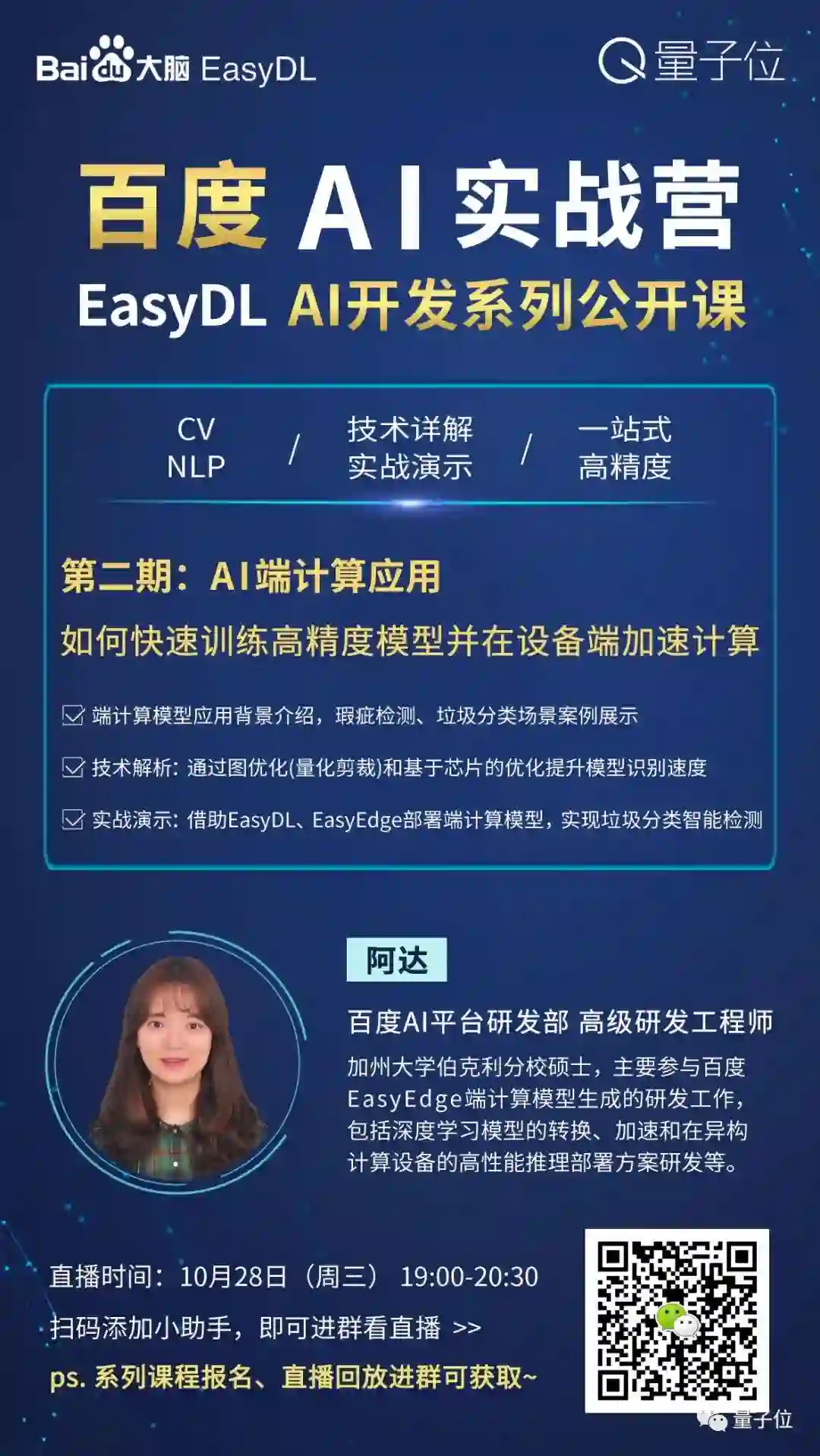 10月28号,第二期「EasyDL AI开发系列公开课」直播中,百度高级研发工程师将深入讲解如何优化端模型识别速度、如何解决端模型部署问题,同时手把手直播演示如何使用EasyDL&EasyEdge进行模型训练和端模型部署。