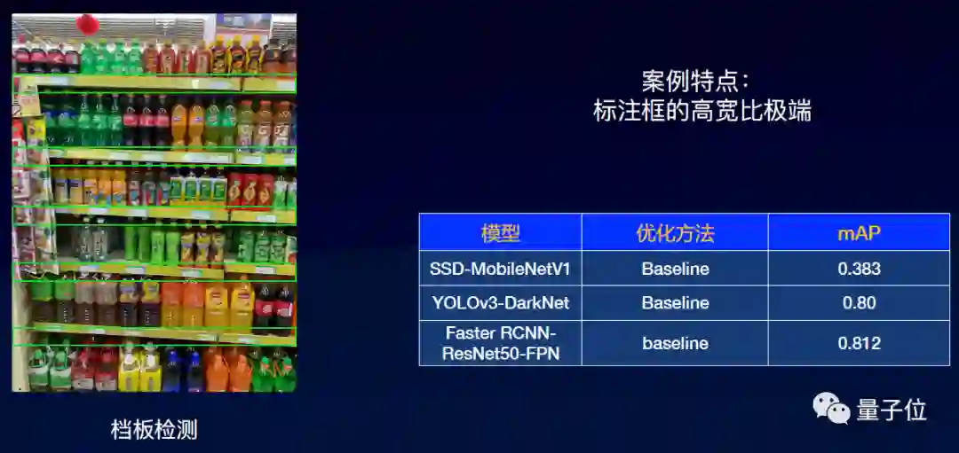 如图中绿框所示,货架挡板检测的难点在于货架挡板的高宽比非常极端,我们先选一些基础的模型来训练。