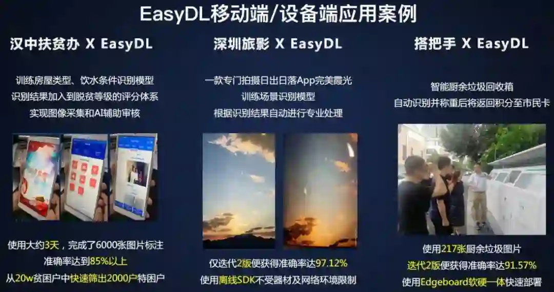 以上是EasyDL在移动端/设备端的应用案例,以深圳旅影为例,用户训练一个场景识别的模型,仅仅迭代两版就获得了97%以上的准确率,效果非常不错。