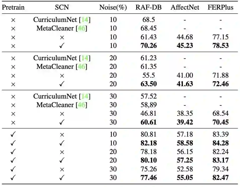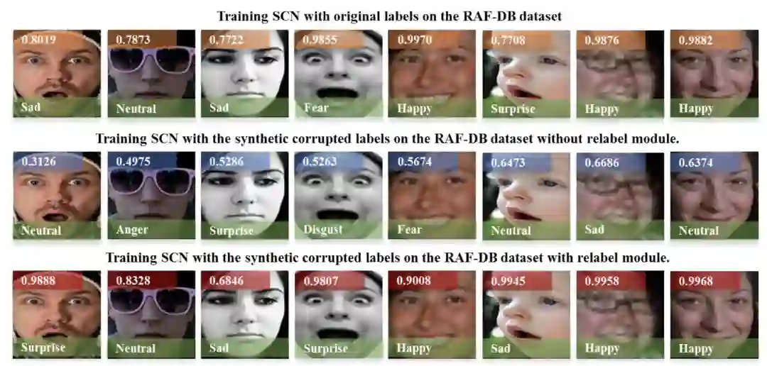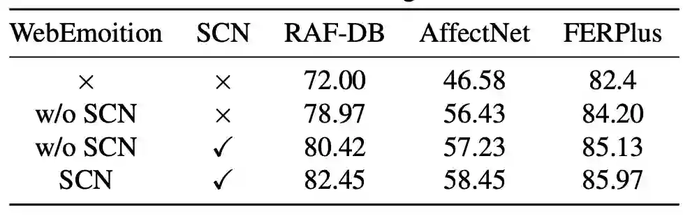 最后一个模块是careful relabeling模块,它试图通过将最大预测概率与给定标签的概率进行比较来重新标记来自底层组的这些样本。如果一个样本的最大预测概率高于给定的带有边缘阈值的标签,则将该样本分配给一个伪标签。此外,由于不确定的主要证据是不正确的/噪声注释问题,从互联网上提取了一个极端噪声的FER数据集,称为WebEmotion,来研究SCN对极端不确定性的影响。